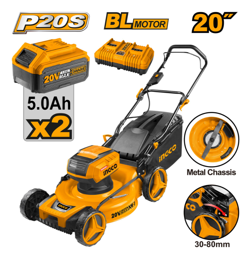 CORTA CESPED 20V 20» P20S C BAT Y CARGADOR-Motor sin escobillas-Voltaje: 40 V (20 V + 20 V)-Velocidad sin carga: 2800 rpm-Diámetro máximo de corte: 510 mm-Rango de altura de corte: 30-80 mm-Posiciones de altura de corte: 8 marchas-Capacidad de la bolsa: 60L-3 funciones: embolsado/mulching/descarga lateral-Voltaje de carga: 220-240V50/60Hz-Con paquete de batería de 2pcs 5.0Ah-Con cargador de doble puerto 1pcsEmbalado por caja de color