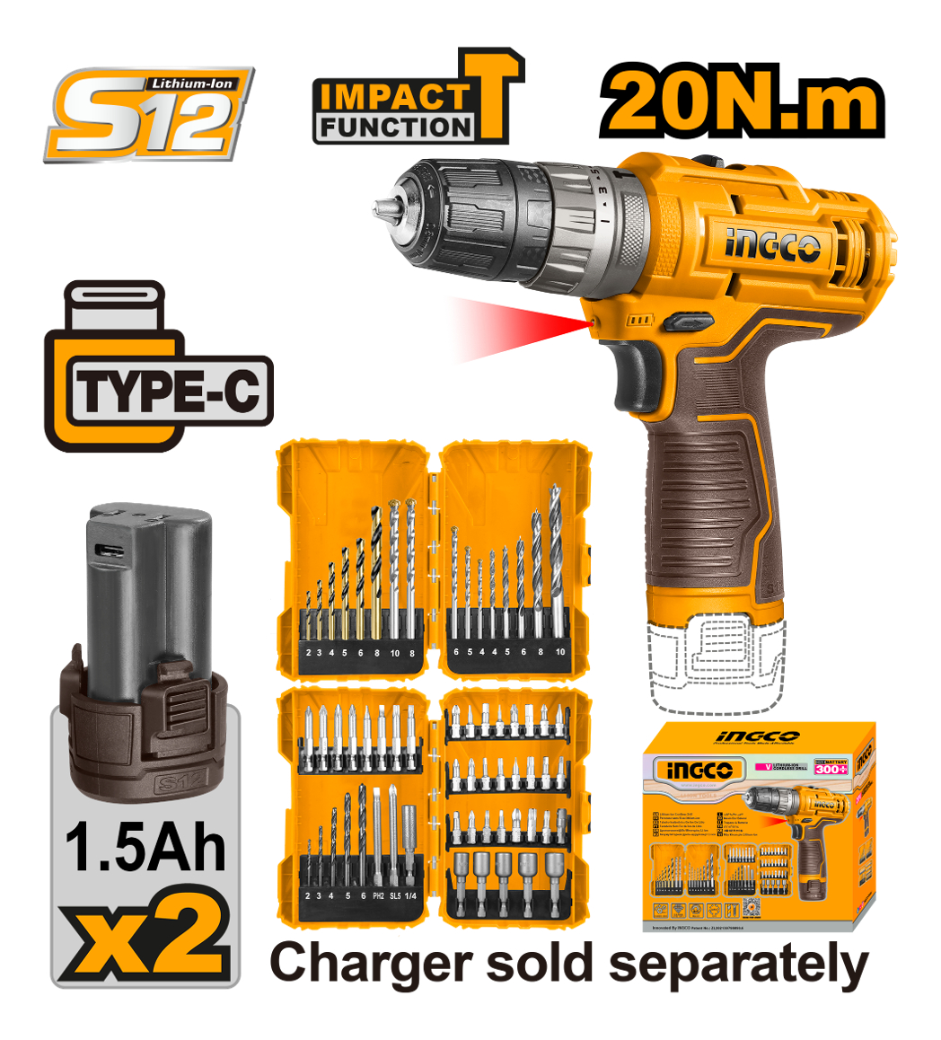 KIT ATORNILLADOR A BATERIA 12V S12 C PERCUTOR 20NM + SET DE MECHAS + PUNTAS + 2 BAT-Voltaje: 12V-Taladro de impacto de iones de litio 1PCS (CIDLI12202)-Velocidad en vacío: 400/0-1500rpm-Velocidad máxima de impacto: 22500bpm-Par máximo: 20Nm-Portabrocas de plástico-Capacidad del portabrocas: 0.8-10mm(1/32-3/8»>>)-Ajustes de par: 18+1+1-Luz de trabajo LED integrada-Incluye:-2 Pcs 1.5Ah batería (FBLI12153)-1 juego de 45 puntas de destornillador de torsión (AKDL24501)-1 juego de 16 brocas para metal, hormigón y madera (AKDL11601)-Puerto de carga de la batería: USB tipo C-El cargador se vende por separado
