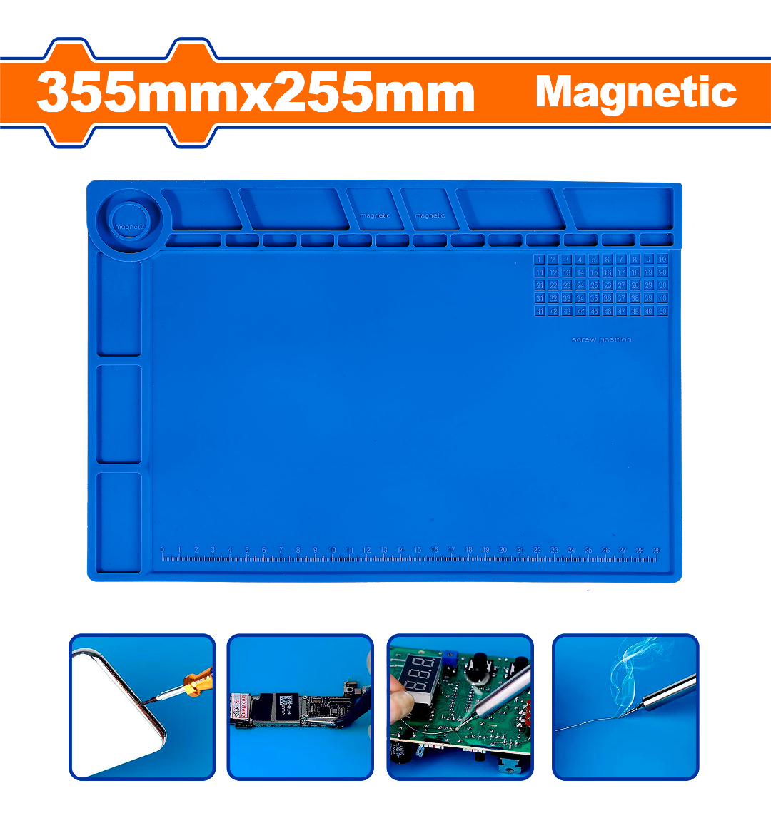 Tamaño: 355mm 255mm-Grosor: 5,5 mm-3 áreas de piezas magnéticas-50 posiciones de tornillos-Regla de escala incorporada: 29cm-Temperatura máxima de resistencia 500 -Silicona de alta calidad,