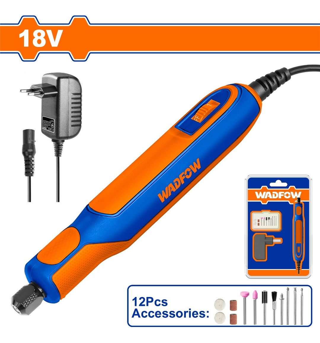 -Voltaje del adaptador CA/CC:-Entrada: CA 220-240V50/60Hz-Salida: CC 18 V-Velocidad sin carga: 0-22000/min-Tamaño de la pinza: 3,2 mm-control de velocidad variable-Incluye:*12 Uds. Accesorios*1 adaptador CA/CC con cable.Embalado en doble blister