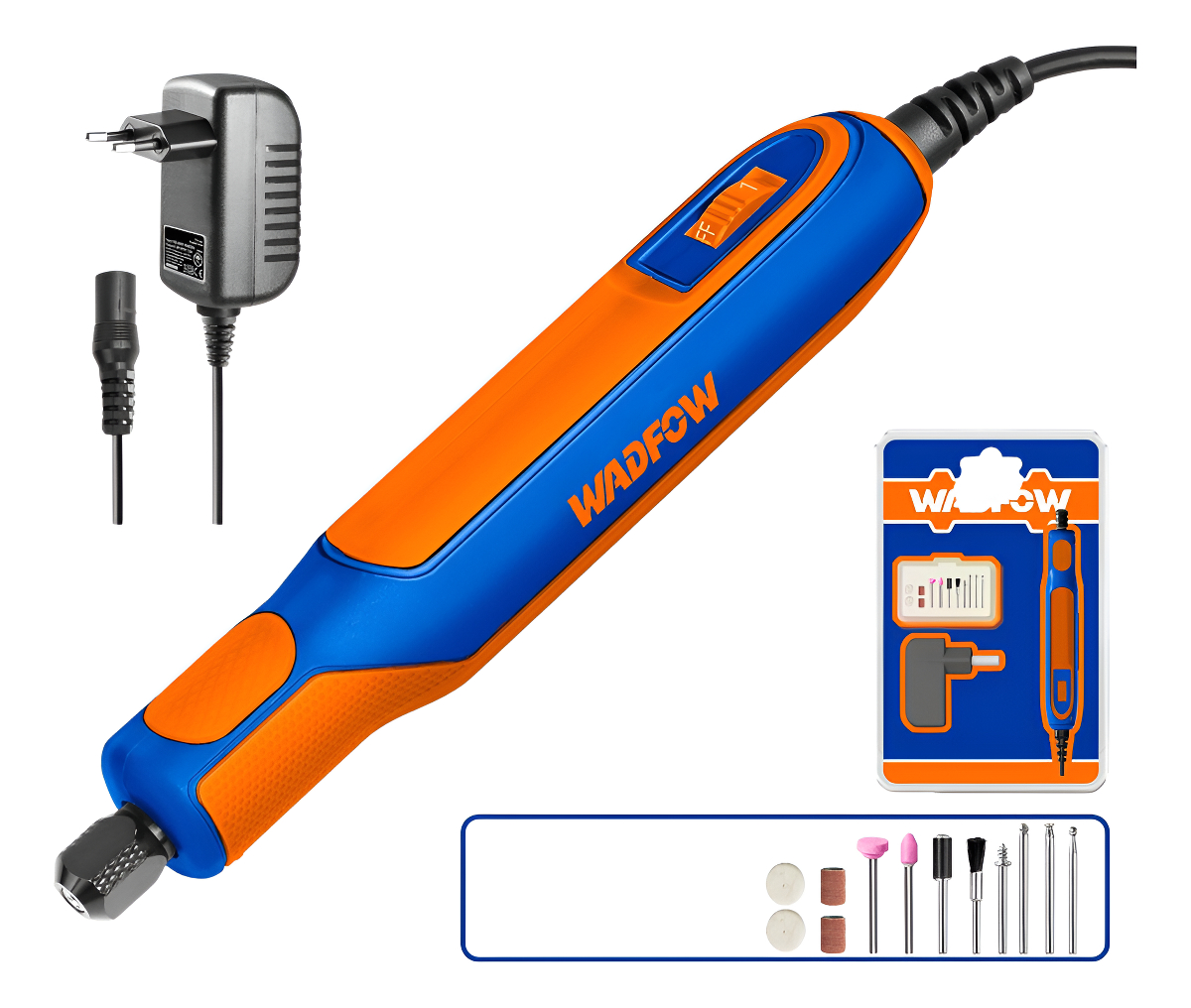 -Voltaje del adaptador CA/CC:-Entrada: CA 220-240V50/60Hz-Salida: CC 18 V-Velocidad sin carga: 0-22000/min-Tamaño de la pinza: 3,2 mm-control de velocidad variable-Incluye:*12 Uds. Accesorios*1 adaptador CA/CC con cable.Embalado en doble blister