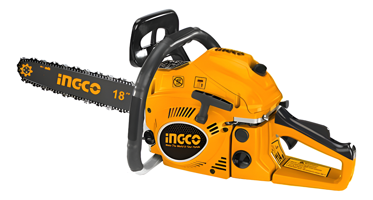 MOTOSIERRA 18» INGCO-Desplazamiento: 46cc-Potencia nominal: 1,8 Kw-Velocidad de ralentí del motor: 3100 +/- 300 rpm-Max. diámetro de corte: 445 mm (18