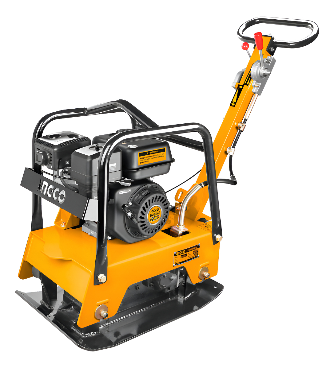 Motor de gasolina INGCO Potencia del motor: 4.8Kw (6.5HP) Peso: 127Kgs Frecuencia: 4300 VPM Fuerza centrífuga: 25kN Profundidad de compactación: 30 cm Velocidad de viaje: 25 cm / s Eficiencia: 500M2 / Hr Tamaño de la placa: 63*40 cm Embalado por caja de cartón